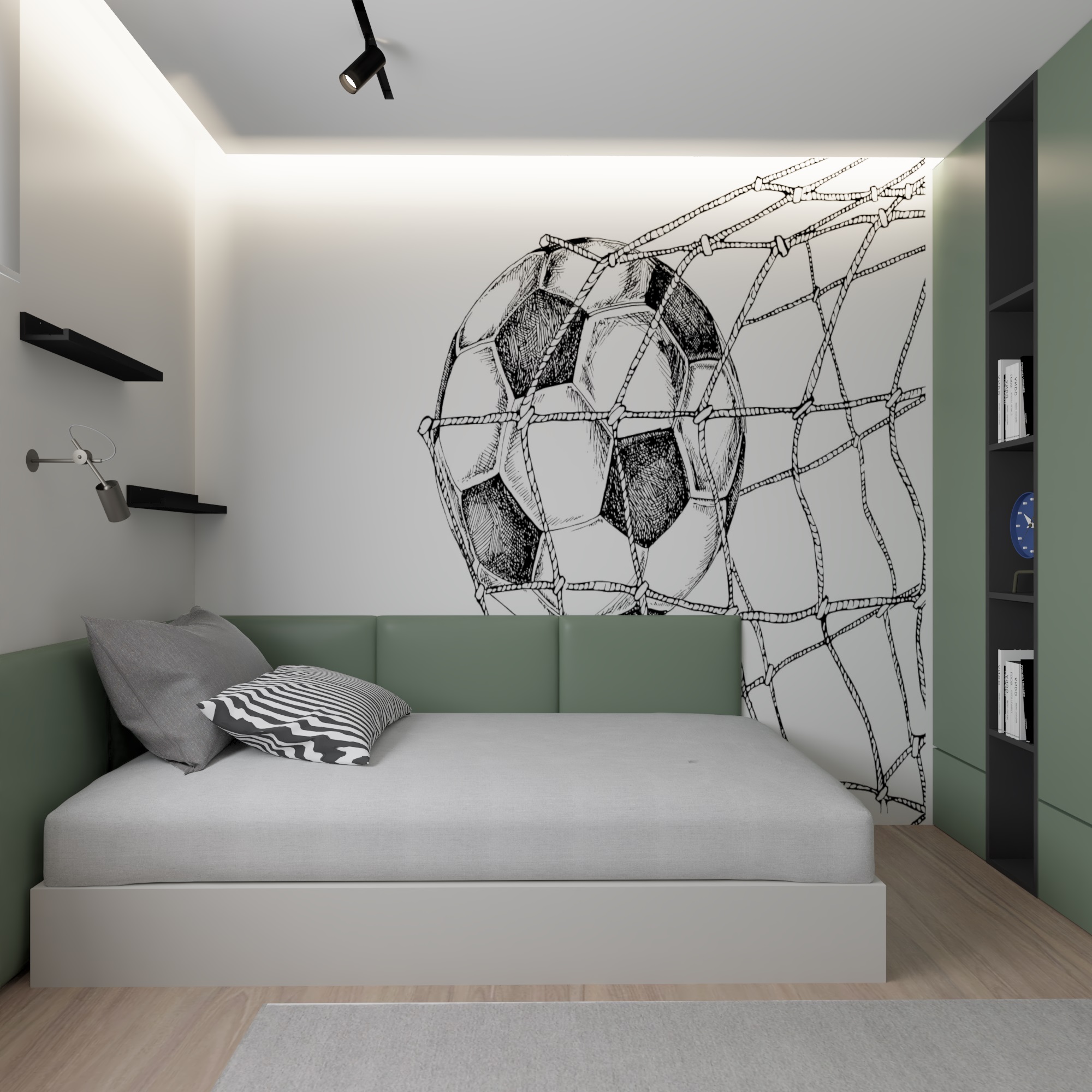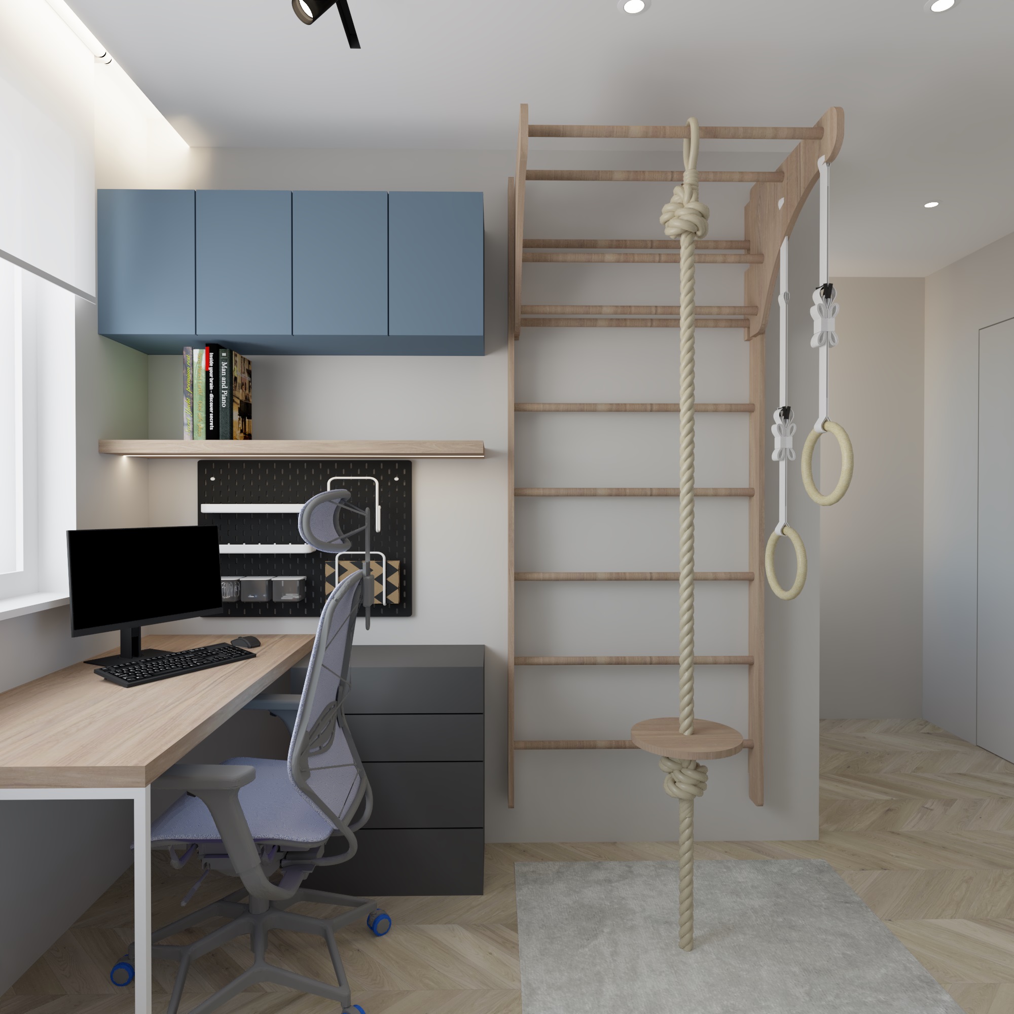 Projekt pokoju dziecięcego w Tychach. Przestrzeń została zaprojektowana tak, aby łączyć funkcję zabawy, nauki i odpoczynku, z naciskiem na bezpieczeństwo i wygodę codziennego użytkowania.